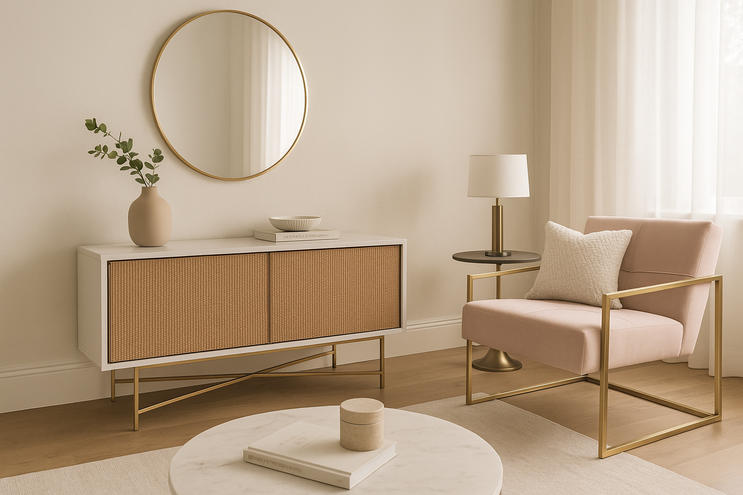 Immerse yourself in the beauty of modern minimalism where soft textures, warm neutrals, and refined gold accents come together in perfect harmony. This inviting space blends contemporary design with timeless comfort, featuring clean lines, natural materials, and subtle details that elevate everyday living into effortless luxury.