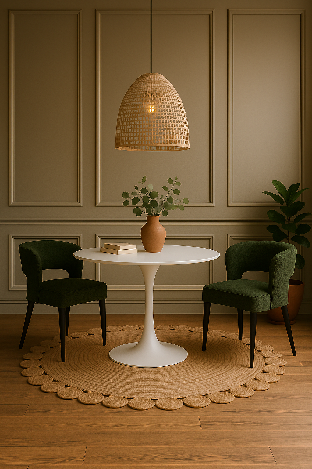 Even small spaces can make a big impact. With a clean white table, natural textures, and rich green tones, this look brings warmth, balance, and effortless style to any home. Thoughtful design proves you don’t need a lot of space to create something beautiful.